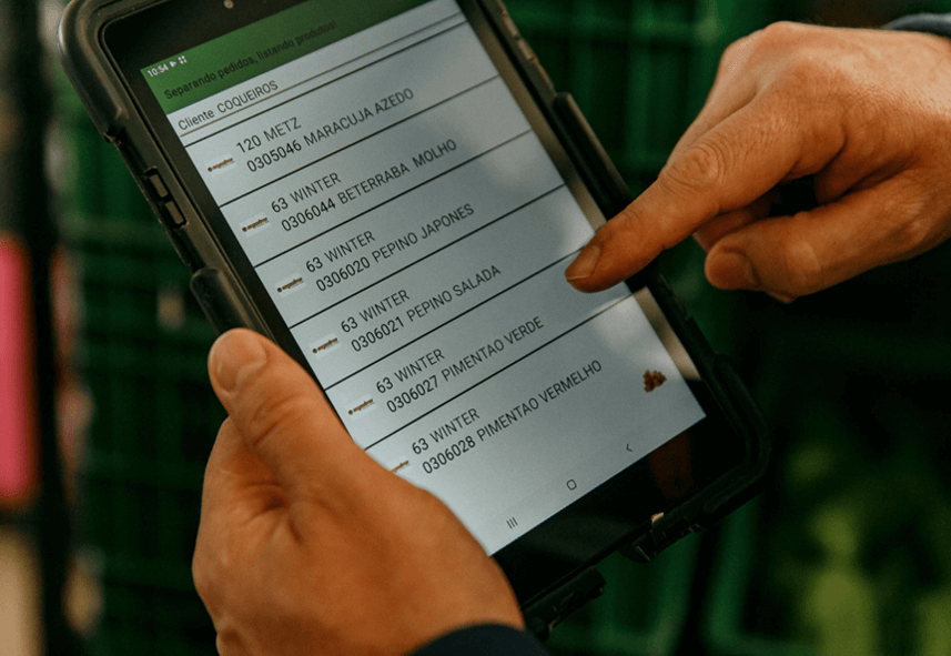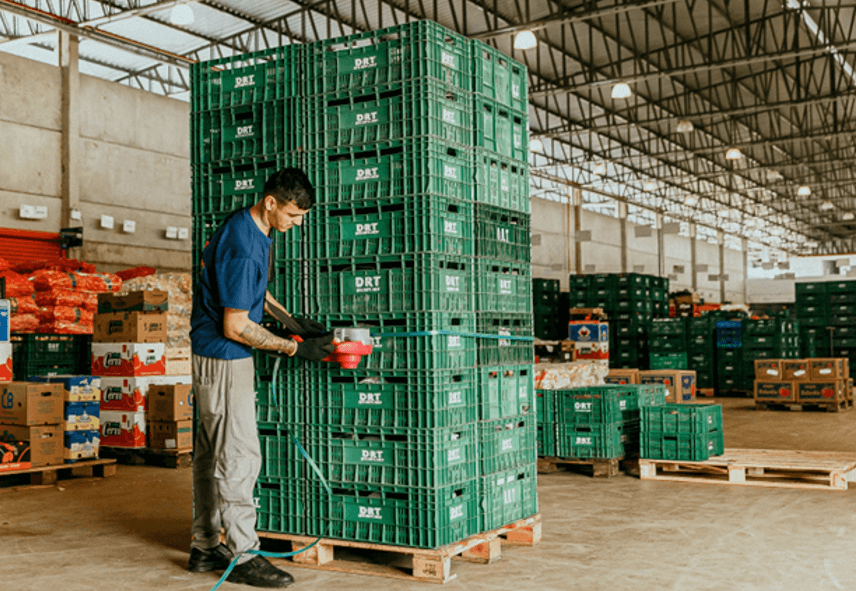 Separação dos produtos por loja, com acondicionamento em pallets estabilizados por strech (filme de polietileno) ou cinta.
